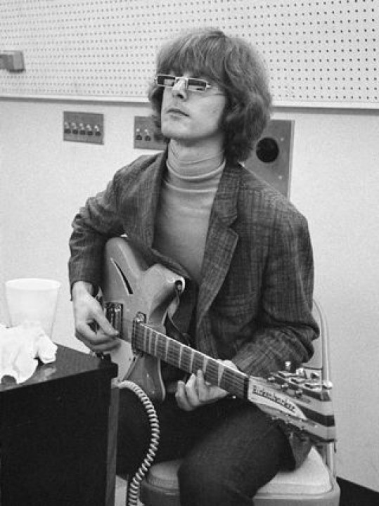 Roger "Jim" McGuinn records with the Byrds their first hit single "Mr. Tambourine Man" using his new and distinctive sounding round top Mapleglo 360/12, serial number DJ451